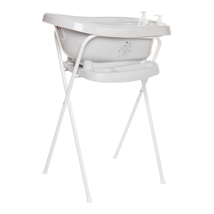 Υπέροχο σετ μπάνιου της εταιρίας Bebejou μοντέλο Thermobath!Το μπάνιο: Το Bebejou Thermobath έχει όμορφο σχεδιασμό, 2 dispenser για σαπούνι, ενσωματωμένο σωλήνα νερού και θερμόμετρο. Το κομψό βρεφικό μπανάκι με ασφαλές σύστημα αποχέτευσης είναι κατασκευασμένο από πλαστικό.Με το Bebejou Thermobath έχετε σχεδόν τα πάντα στη διάθεσή σας για να κάνετε μπάνιο το παιδί σας. Το βρεφικό μπάνιο έχει όμορφο σχεδιασμό και με μια ματιά μπορείτε να διαβάσετε και να παρακολουθήσετε με ακρίβεια τη θερμοκρασία του νερού. Επιπλέον, διαθέτει ασφαλές σύστημα αποχέτευσης, το οποίο μπορείτε να αποσυνδέσετε χωρίς να βάλετε το χέρι σας στο νερό. Με το σύστημα -κλικ, το μπανάκι τοποθετείτε εύκολα επάνω στη βάση μπάνιου Bebejou και όλο μαζί (μπάνιο & βάση) τοποθετηθείτε στο ντους ή στη μεγάλη μπανιέρα ή και πάνω απο τη λεκάνη της τουαλέτας. Τα ειδικά αντιολισθητικά πόδια στο κάτω μέρος του μπάνιου αποτρέπουν τυχόν ζημιές στο μπάνιο σας και διασφαλίζουν επίσης ότι αποστραγγίζεται όταν χρησιμοποιείται τη μεγάλη μπανιέρα. Για να διατηρείται καθαρό το μπανάκι, είναι σημαντικό να ξεπλένετε με ζεστό νερό μετά από κάθε χρήση και να το σκουπίζετε με ένα πανί.Ιδιότητες: Κατασκευασμένο από υψηλής ποιότητας υλικό Ενσωματωμένο βύσμα μπάνιου και θερμόμετρο Ασφαλές σύστημα αποχέτευσης Περιλαμβάνει 2 δοσομετρητές σαπουνιού Διαστάσεις: 83,5x40x32 cmΗ βάση: Η μεταλλική βάση για τη μπανιέρα έχει ύψος 98 cm, βάση για το κρέμασμα πετσέτας και θέση για το σαπούνι. Η βάση είναι αναδιπλούμενη και είναι εξοπλισμένη με το καινοτόμο σύστημα Click. Μόλις 2 κλικ και η μπανιέρα τοποθετείται εύκολα και με ασφάλεια στη βάση μπάνιου. Η μπανιέρα μπορεί να αποσπαστεί από τη βάση εξίσου εύκολα με ένα κλικ. Συνιστάται καθώς είναι πολύ σημαντική η σωστή στάση του σώματος σας κατά τη διάρκεια του μπάνιου του παιδιού. Επίσης θα έχετε τα πάντα κοντά σας και να δεν θα χρειάστεί να απομακρυνθείτε απο το λουσμένο παιδί. Η βάση Click της Bebejou είναι επομένως εξοπλισμένη με μια ενσωματωμένη θήκη για πετσέτα ή μπουρνούζι και ένα μέρος για να τοποθετείτε σαπούνι ή τζελ μπάνιου και σαμπουάν. Μην αφήνετε ποτέ ένα παιδί χωρίς επίβλεψη ενώ κάνει μπάνιο. Η μεταλλική βάση ύψους 98 cm για το μπανάκι του μωρού μάζι με το βρεφικό μπάνιο αντιπροσωπεύει ένα πλήρες σύστημα για το μπάνιο των παιδιών σας. Η ασφάλειά τους έχει δοκιμαστεί από τη μεγαλύτερη αρχή στον τομέα των δοκιμών, το γερμανικό ινστιτούτο δοκιμών TUV.Βάρος: 4,05 kg. Διαστάσεις Συναρμολογημένο για χρήση: 61.2×54.4×99.6 cm Διπλωμένο για αποθήκευση: 61.2×8.5×110 cm