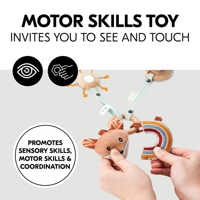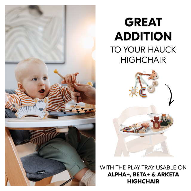 Εύκολη τοποθέτηση: το δαχτυλίδι του παιδικού παιχνιδιού μπορεί εύκολα να βιδωθεί στο παιδικό καρεκλάκι Hauck με την ξύλινη βίδα που περιλαμβάνεται.Τα στοιχεία παιχνιδιού συγκρατούνται στη θέση τους με κορδέλες.