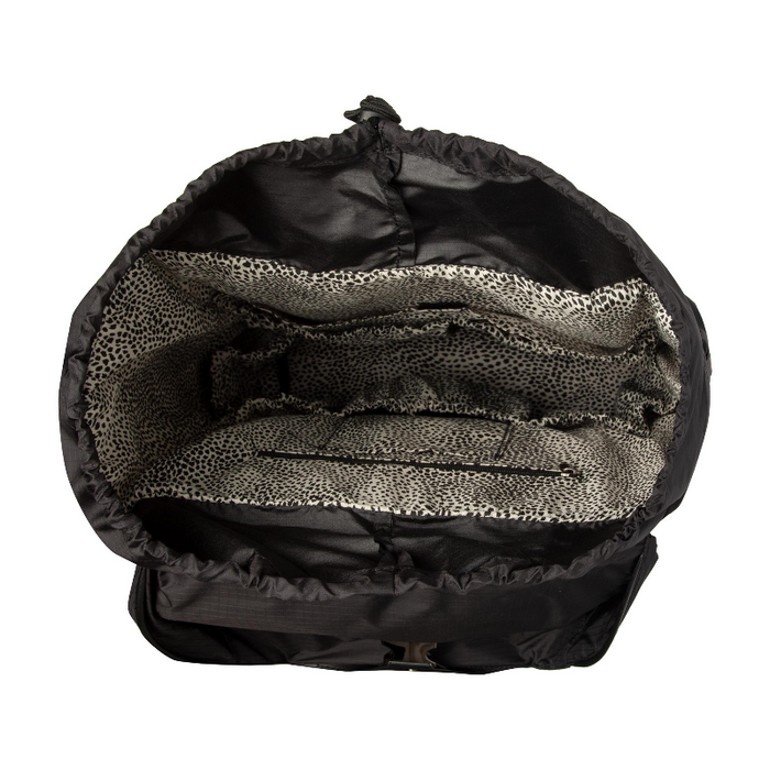 Το εξωτερικό αυτού του μαύρου σακιδίου είναι εξοπλισμένο με ripstop πολυεστέρα, το εσωτερικό από λείο πολυεστέρα σε μοντέρνα στάμπα λεοπάρ.